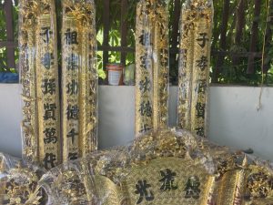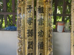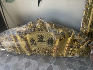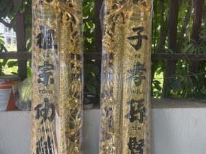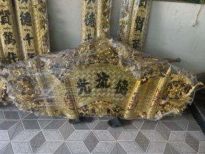 | Kích thước (cm) | hoành phi 197×69 dày 4 cm; câu đối 197×28 dày 4 cm |